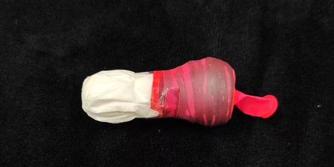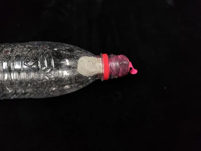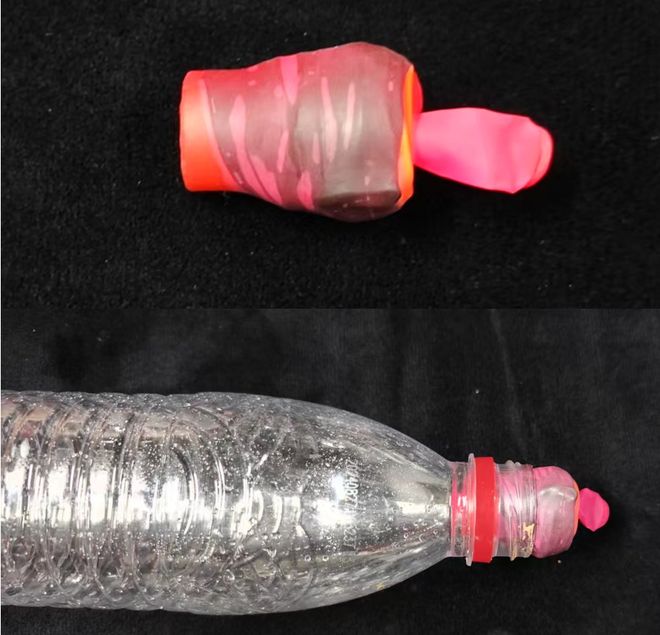 然后将气球套上制作的瓶口塞子,就可以利用气球的橡胶材质,达到橡胶塞的使用效果啦!